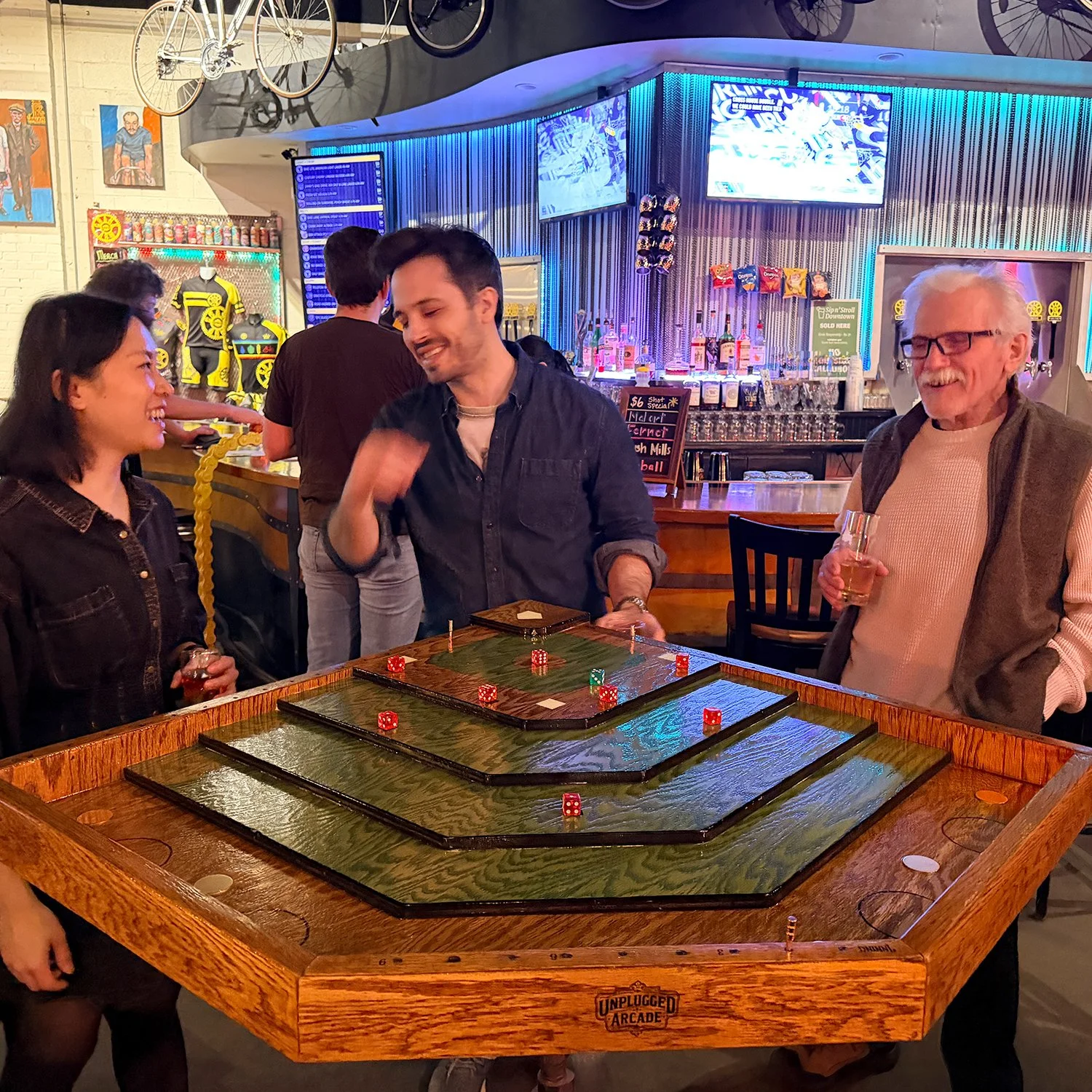 Board games and video games have rapidly evolved, but barroom games have remained virtually stagnant. Pool, darts, and shuffleboard are classics, but social spaces deserve new playful experiences too. Unplugged Arcade brings modern game design and product innovation to address the needs of today’s social venues and audiences.